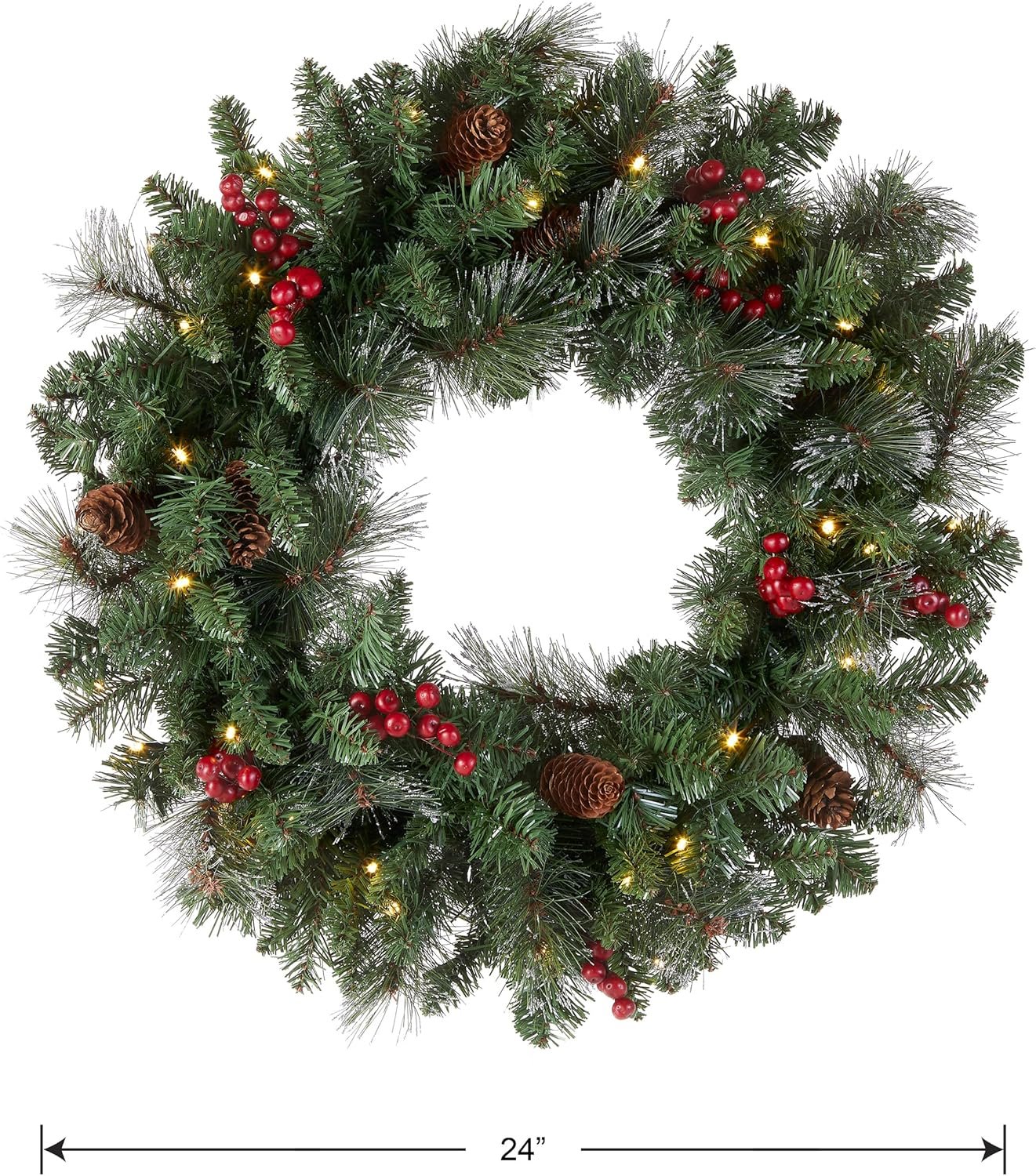 - Designed with a Crestwood Spruce branch base, this pre-lit artificial Christmas wreath is 24 inches wide and decorated with pine cones, berry clusters and frosted branches.