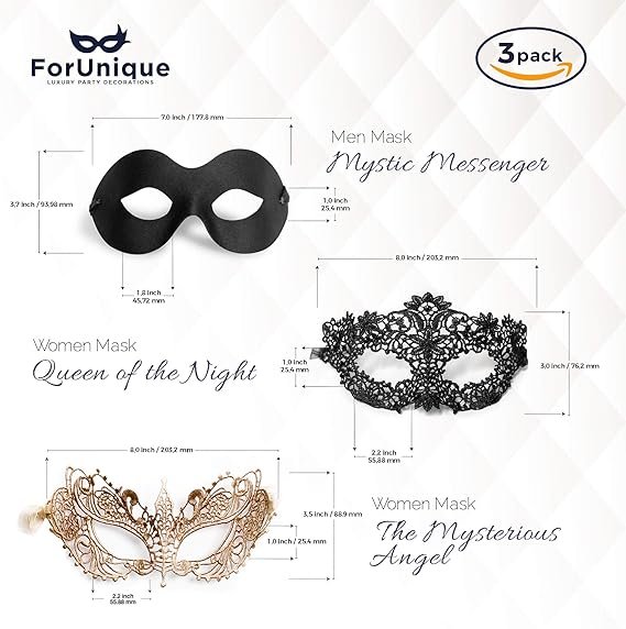 - 🎭 3 PACK MASQUERADE MASK FOR COUPLES SET: Boys & Girls masquerade mask kit includes one gold and one black lace masquerade masks for women and a classic black masquerade mask for men. Mix-and-match as you please!