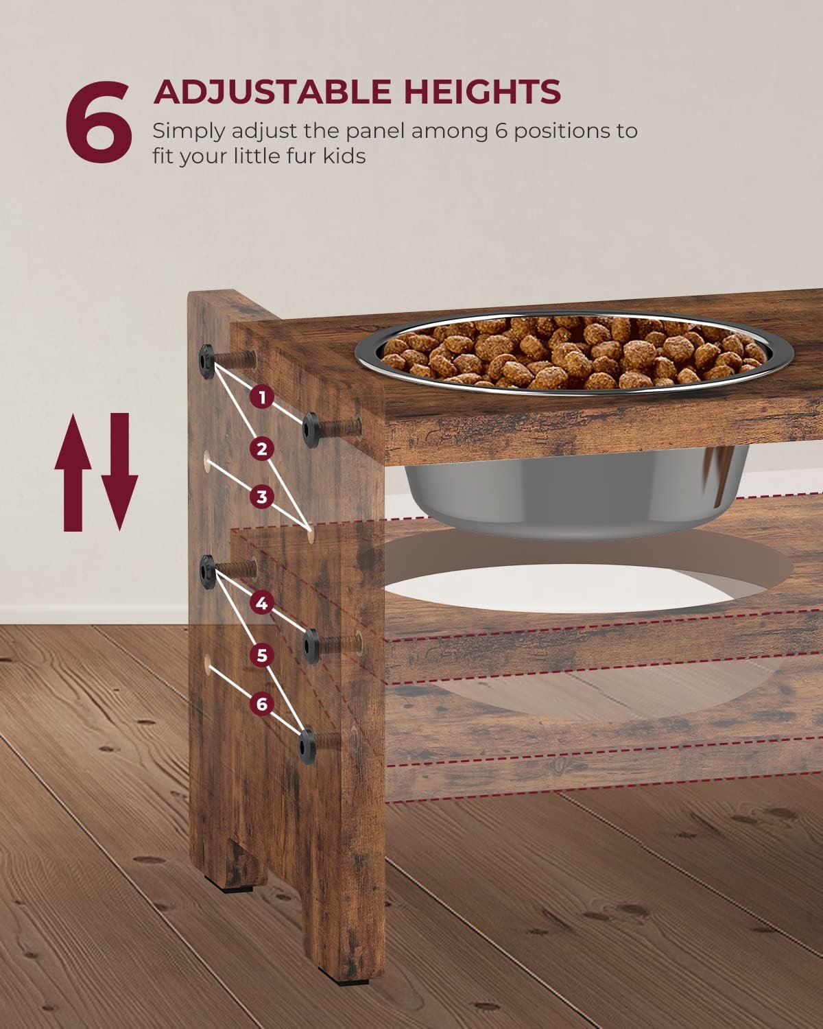 Vantic Elevated Dog Bowls, Adjustable Raised Dog Bowl Stand for Small Puppy and Cats, Sturdy Pet Food Feeder with 2 Stainless Steel Dishes, Rustic Brown